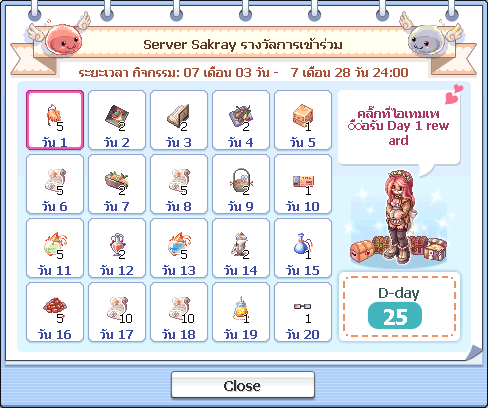 ผู้เล่นสามารถเข้าร่วมกิจกรรมได้ทุกวัน เพียงแค่ผู้เล่น Login และกดรับไอเทมจากหน้ากิจกรรมได้วันละ 1 ครั้ง และของรางวัลจะถูกเข้า RodEx ของผู้เล่นทันที