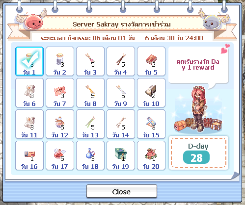 และของรางวัลจะถูกเข้า RodEx ของผู้เล่นทันที และหากเพื่อนๆรับไอเทมติดต่อกัน 7 วันแล้ว แล้วหยุดรับ ไป 2 วัน